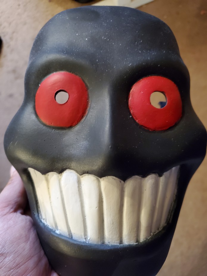 The masks are done and ready to go. They also look amazing. I took a picture of one of them – it looks even better in person and there’s a reason for it in the book. The craftsmanship is stellar, too; its some of the best made mask work I’ve seen with a project.